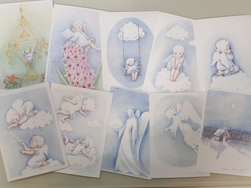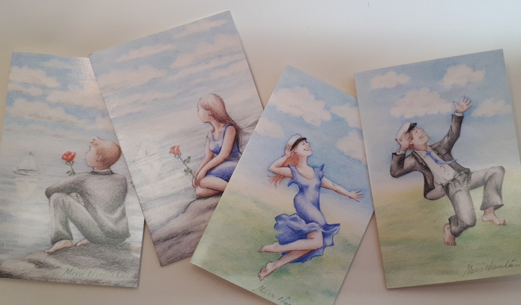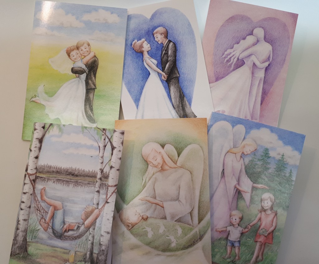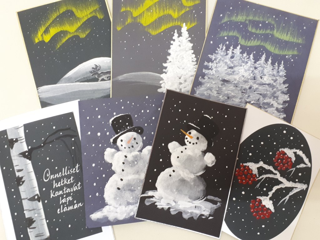Tässä onnittelukortteja, kiitoskortteja yms. Kirjoitan tekstin toiveesi mukaan ja maalaan sekä piirrän myös jokaiselle uniikin toiveen mukaan.