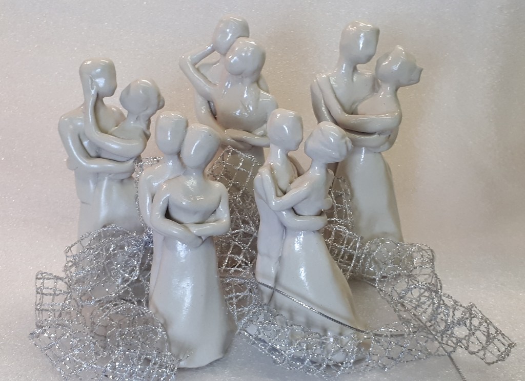 Yhdessä patsaat muistoina kauniista hetkistä tai kakkukoristeeksi . Pohjassa reiät, joten koristeen saa pysymään pystyssä kakussa tikuilla. 42 €. (koko vaihtelee 12 -14 cm )